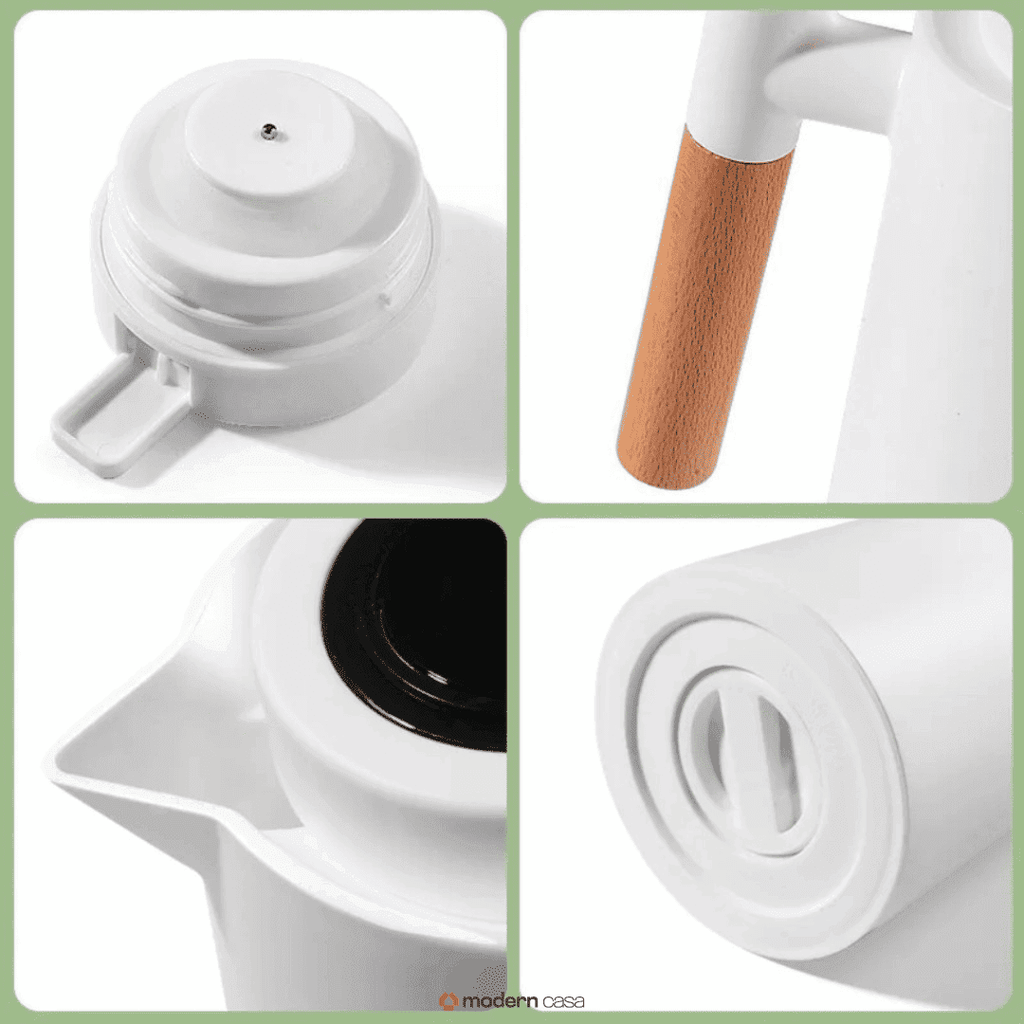 - Material: Vidro interno, plástico resistente (PP) e cabo de madeira