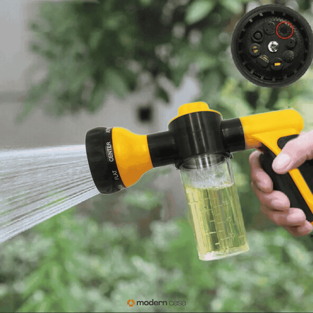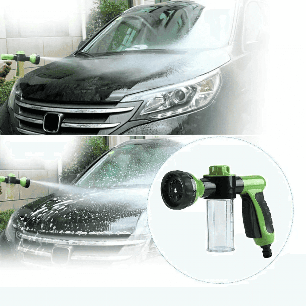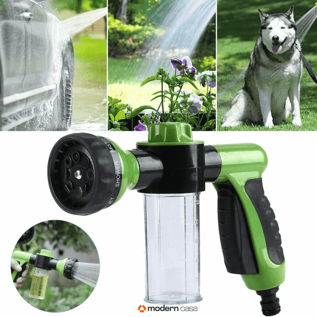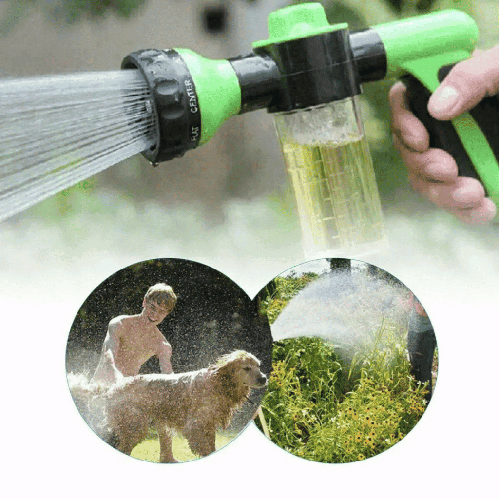 Conecte à sua mangueira de uso diário, encha o dispensador com shampoo/sabão e deixe a mágica acontecer. (Existe um modo apenas para água e outro para água + shampoo/sabão) .